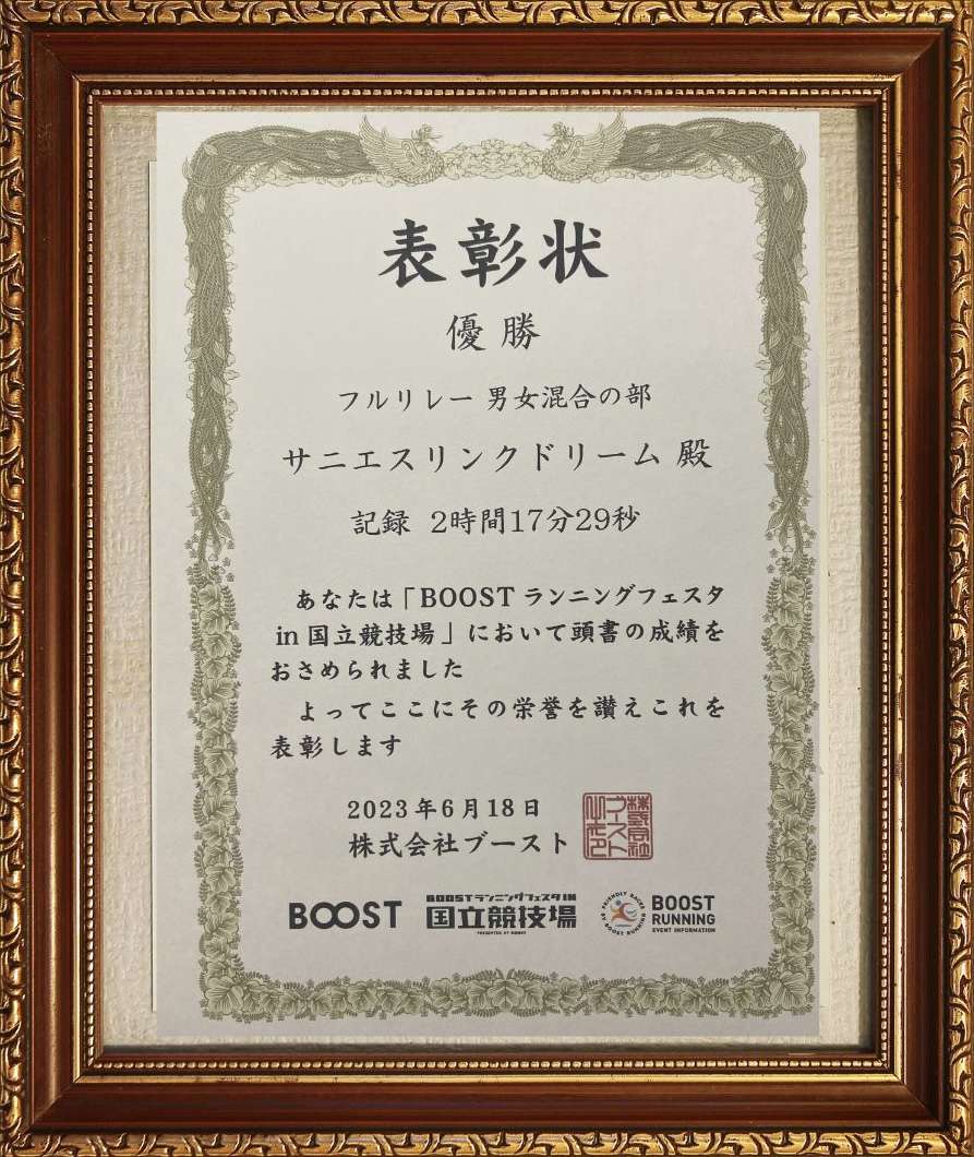 2023.6.18②サニエスリンクの夢を託し結成した“ドリームチーム“が見事部門優勝を果たし、表彰台に上がりました。9人の精鋭達は心を一つにタスキを繋ぎその走る姿は圧巻でした。