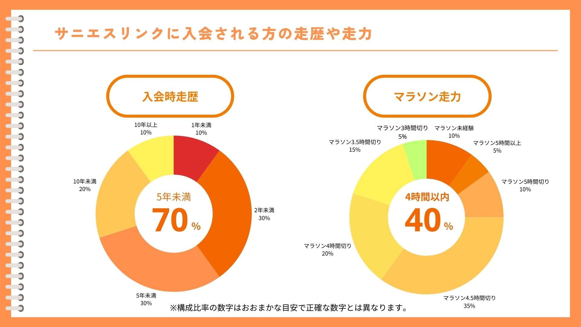 入会時の走歴は2年程度がもっとも多いです。最初のうちはジョギングだけでも定期的に走れば走力がついてきますが、我流だと少し伸び悩みを感じる時期ですね。